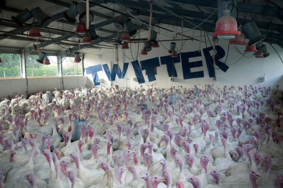 O fotógrafo e artista italiano Filippo Minelli brinca com nossos sentimentos e percepções na sua exposição “Contradictions”. Ele apresenta fotos de lugares desconhecidos “taggeados” com marcas, nomes e conceitos que transformaram o mundo nos últimos anos. A relação do lugar e da palavra tem sempre uma mensagem implícita que mexe um pouco com a gente seja pelo seu humor ou sarcasmo. Por exemplo, em uma granja de perus, o artistas escreveu twitter, em uma alusão à rede social que mais cresce no mundo em cima de uma certa “tagarelice” dos usuários. Um ruído muito parecido com o dos perus da foto, não!?